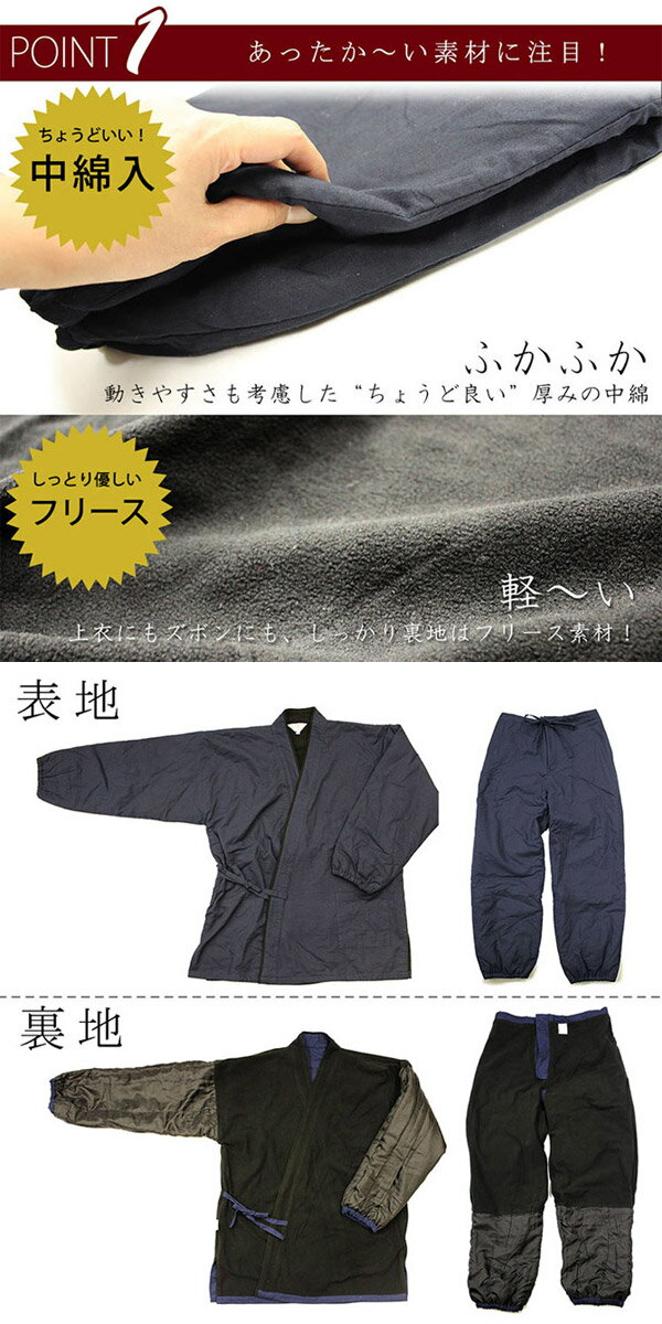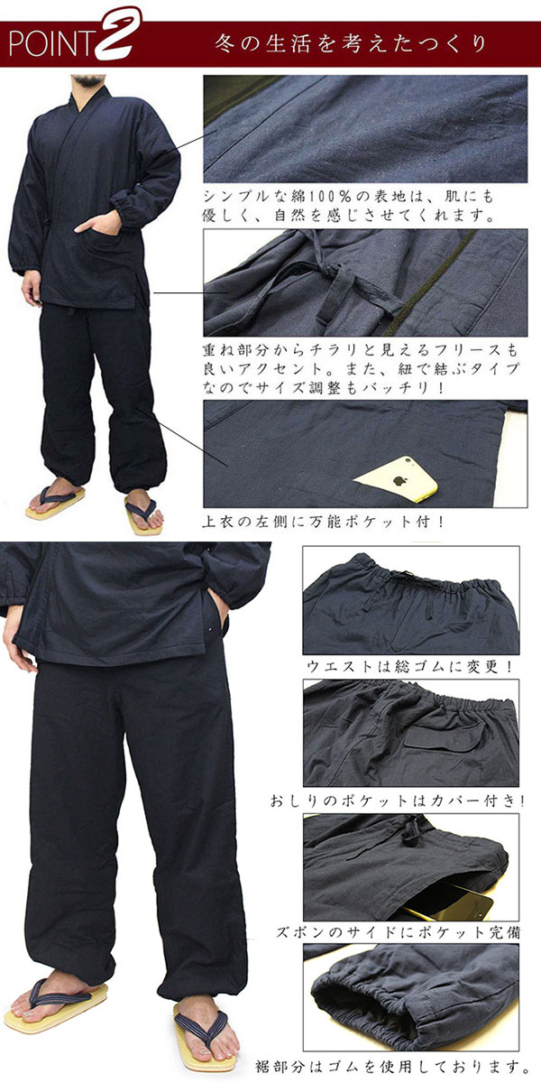 ちょっとした散歩はもちろんのこと、部屋着として、作業着としても快適にお使い頂ける着心地の良いフリース作務衣です。